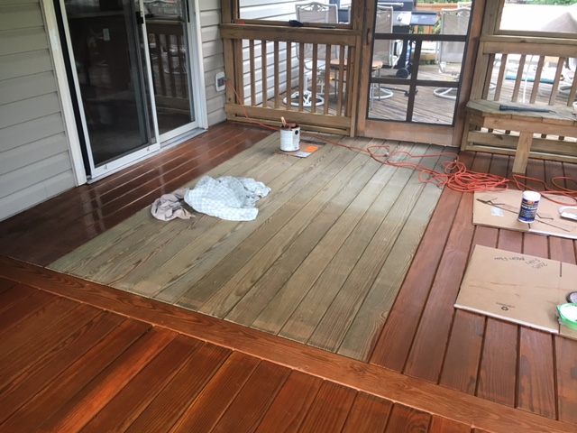 Large project, first pic is outside of porch & deck, next two pics are before & after staining porch floor, used Extreme Redwood stain after Defy wood brightener, a power wash & 48 hrs. to dry.