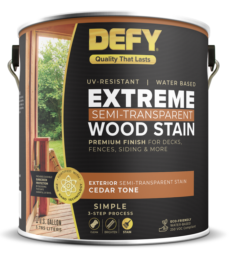 Defy Extreme Wood Stain is a long-lasting synthetic resin, semi-transparent wood finish that helps shield against fungi, water, an