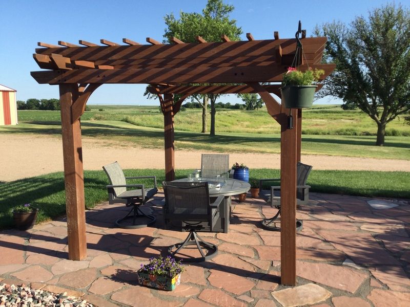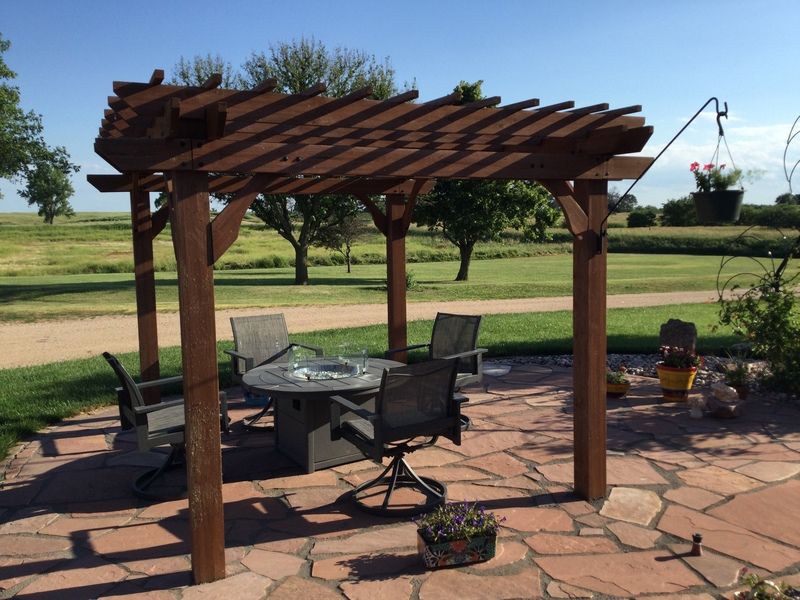 Not really sure the contractor that installed the patio also purchased the pergola but the wood appears to be pine and the stain is not real deep in the wood looking at the cat scratches.