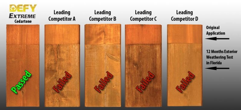 In a leading competitor comparison performed by Q-Labs, Defy improves performance by 200%-600% in accelerated weathering tests by using their new light stabilizing technology over four of the best-selling national brands. All of the Defy stains are VOC compliant and can be shipped to all 50 states. They are available in many natural and darker tones. Defy Stains provide leading protection that will perform better than other water-based deck stains.